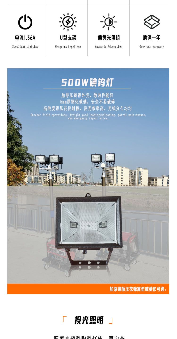 鼎轩照明全方位移动照明车配件500W碘钨灯暖黄光220V1000W